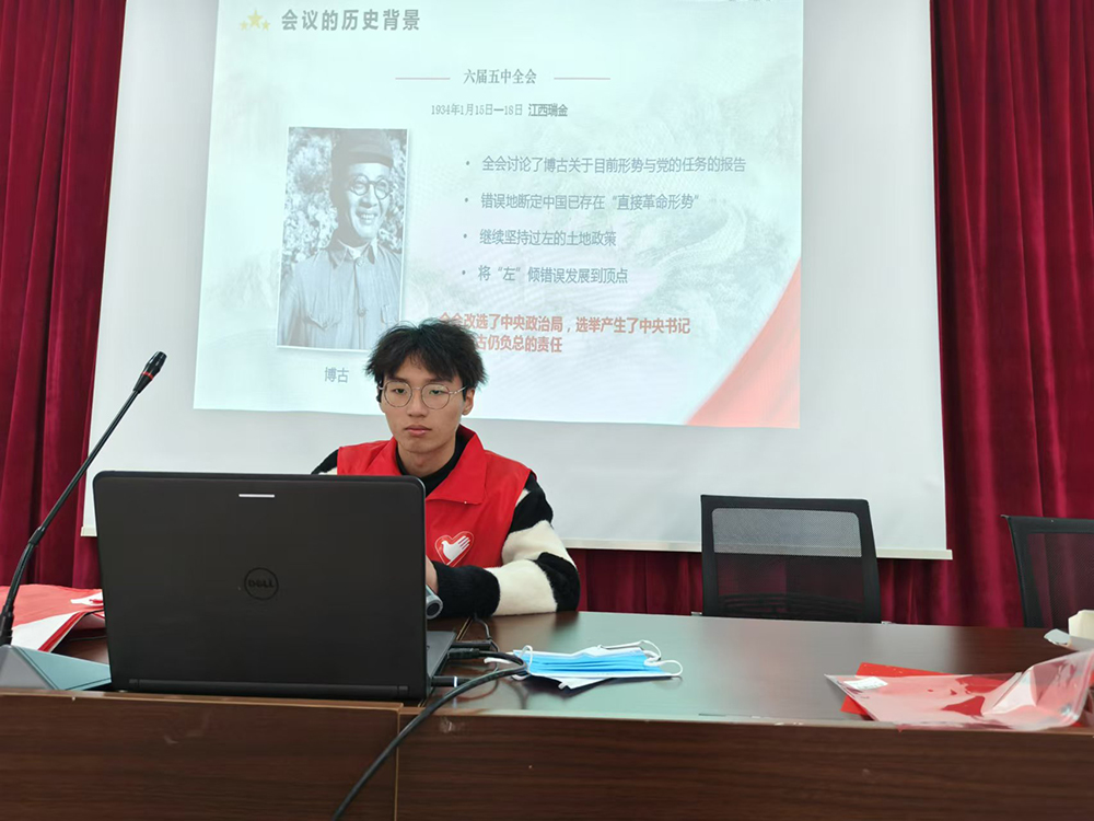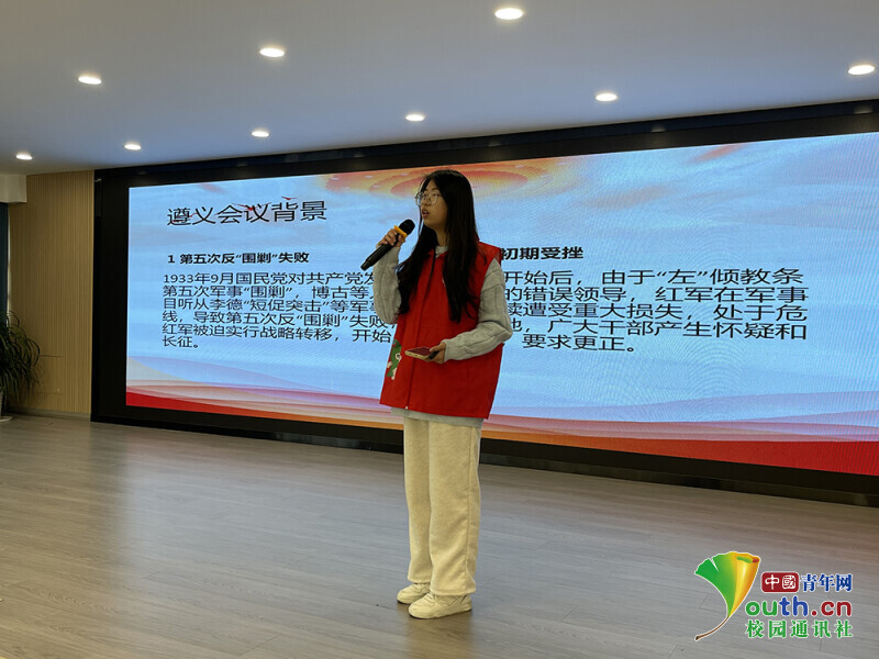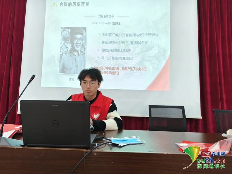 图为宣讲队员在乐清市职业中等专业学校为同学们介绍遵义会议精神的背景。