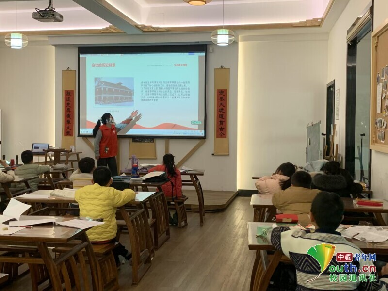 图为宣讲队员在临海大洋社区假日学校讲解遵义会议精神内涵。