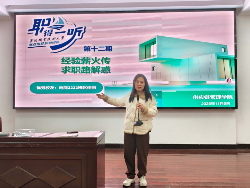 为帮助供应链管理学院学子明确求职方向,提升就业竞争力,11月5日,供应链管理学院邀请2022届优秀毕业生赵佳丽重返校园,在余姚校区阳明报告厅开展以“就业路上,别怕尝试每一场面试”为主题的就业指导讲座。讲座由陈芳铭老师主持,余姚校区50余名在校生参加。