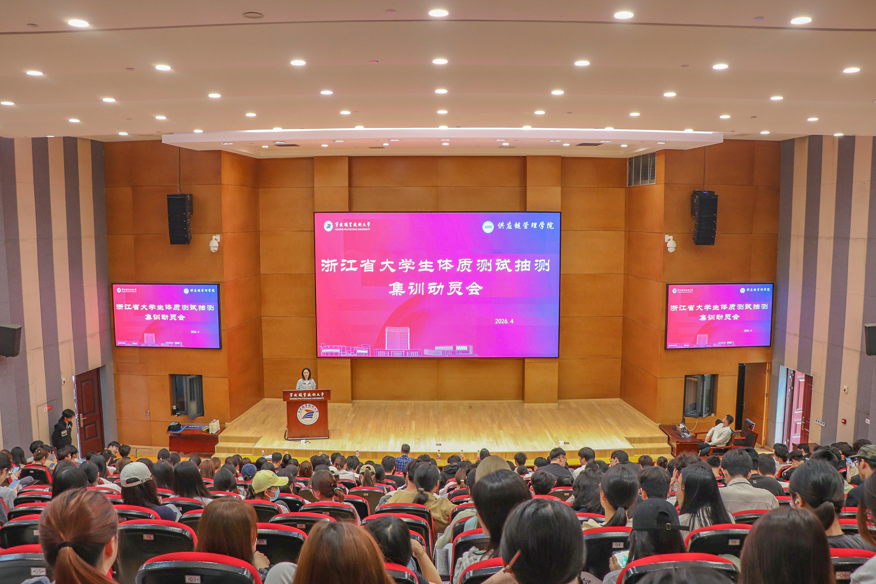 为深入贯彻《浙江省教育厅办公室关于2026年全省高校学生体质健康状况抽测的通知》和《宁波职业技术大学“一校一策”大学生体质提升专项行动方案》文件精神,有效提高学生身体素质。4月9日,我校在联盟大厦四明厅顺利举行2026年浙江省教育厅体质健康抽测集训动员大会。公共基础学院领导班子、学工部副部长徐莺、体育教研室相关老师、供应链管理学院领导班子及全体辅导员、2024级被抽测班级班主任及250名被抽测学生参加大会。会议由供应链管理学院党委副书记竺帅主持。