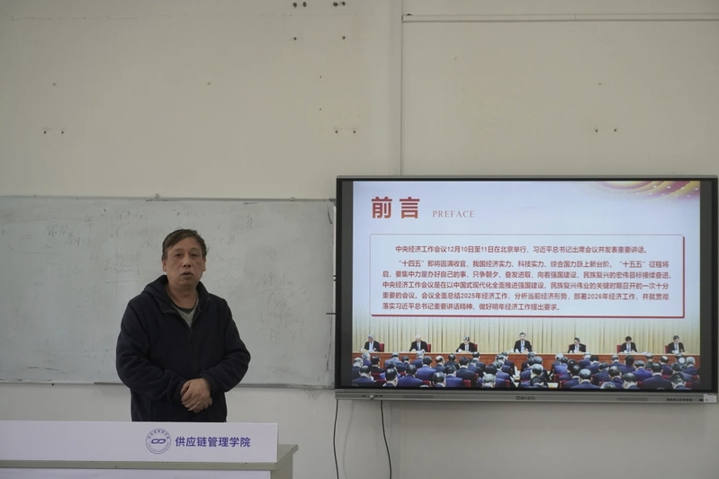 为深入学习贯彻2025年中央经济工作会议精神,加强青年学子对国家经济政策的理解与把握,培养有理想、敢担当、能吃苦、肯奋斗的新时代青年经济建设者,12月18日,宁波职业技术大学供应链管理学院(余姚校区)组织开展“2025年中央经济工作会议精神学习解读”专题党课活动。本次党课由党员教师韩剑鸣主讲,学院入党积极分子参与学习。